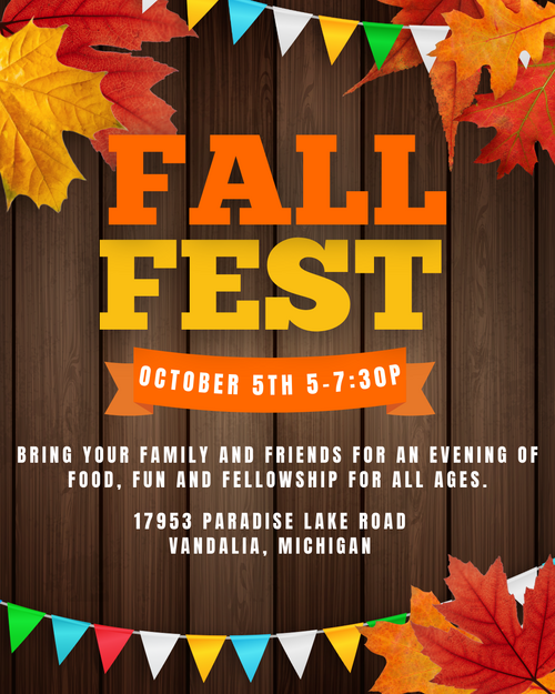 Join us for Fall Fest on Sunday, October 5, from 5 to 7:30PM at 17953 Paradise Lake Road, Vandalia, Michigan. This is a wonderful opportunity for families to come together and enjoy a fun-filled evening. The night will include a chili cookoff, a variety of games, inflatables, and a hayride around the property. Bring your lawn chairs or blankets and enjoy a fabulous night with our church family!