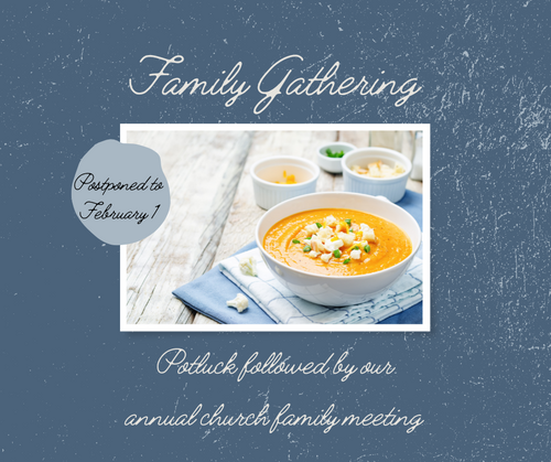 The whole family is invited to our annual Family Gathering on Sunday, February 1st following the worship service. This will be a true potluck...please bring a dish to share! After the lunch we will have a family meeting to vote on the proposed budget and go over a few church family updates.